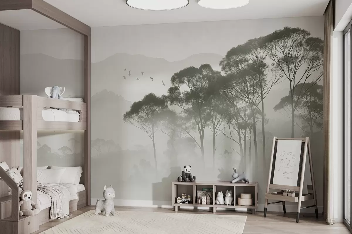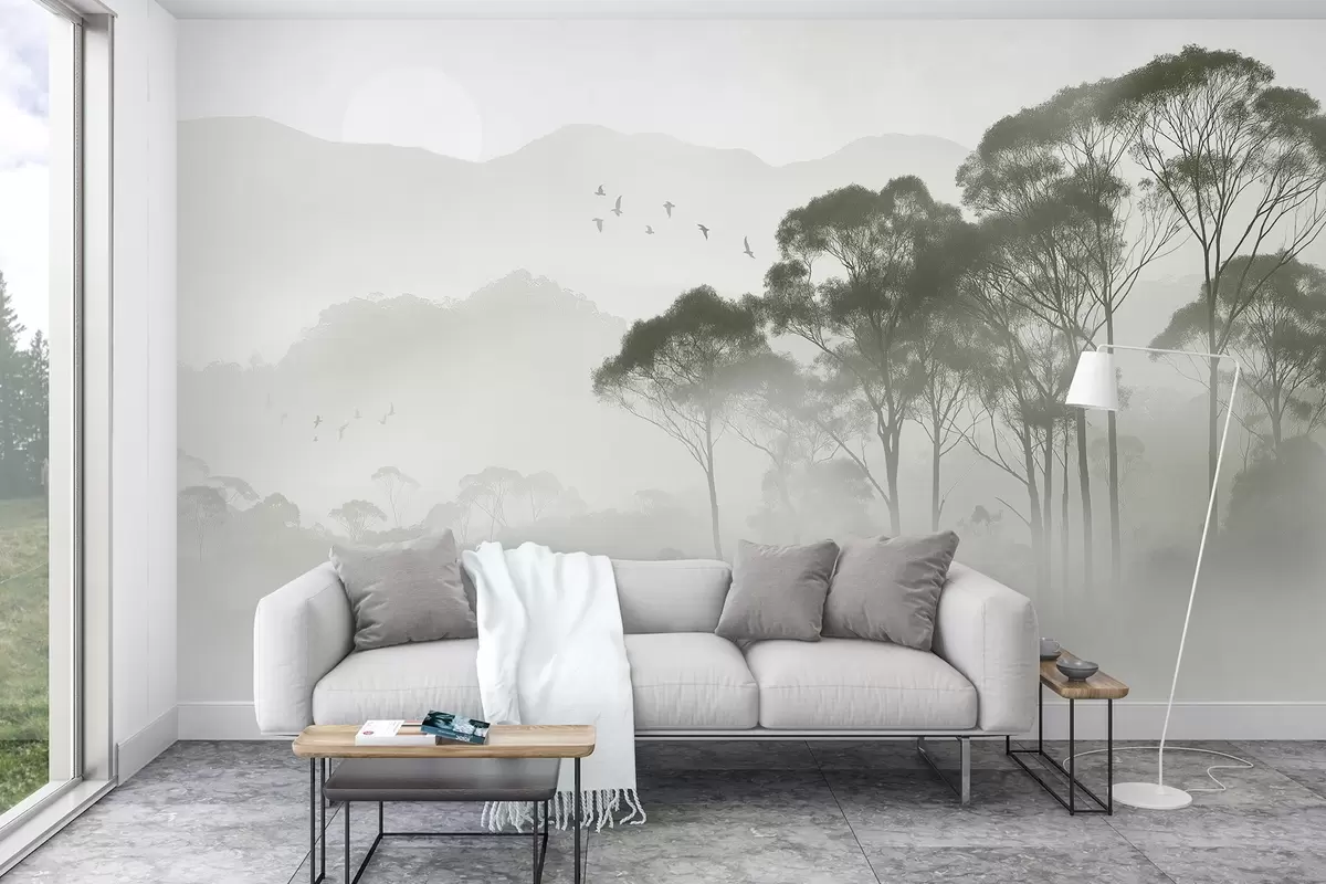 Murais de parede Árvores na neblina, paisagens naturais, pássaros, sol, cores verdes Nr. w02740