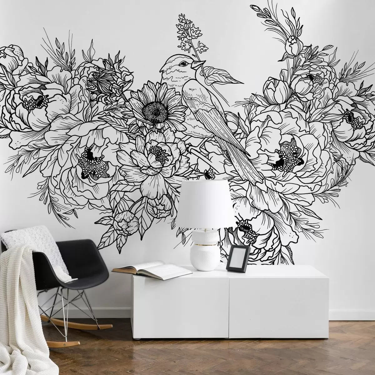 Murais de parede Arte de linha detalhada de pássaro e arranjo floral Nr. w02833v1