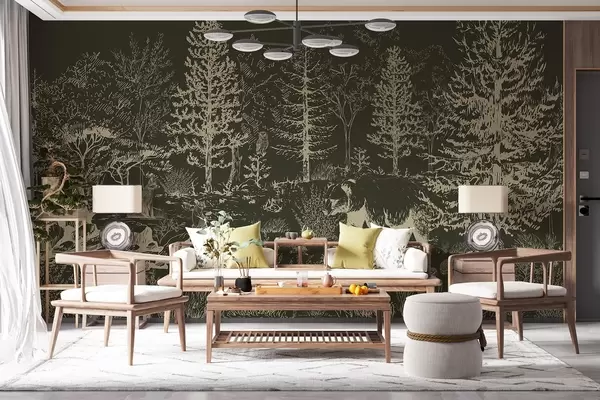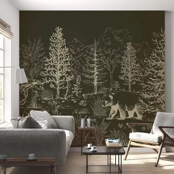 Murais de parede Vida na floresta, árvores, animais selvagens, urso, raposa, coruja, arbustos, fundo verde escuro Nr. w02929v3