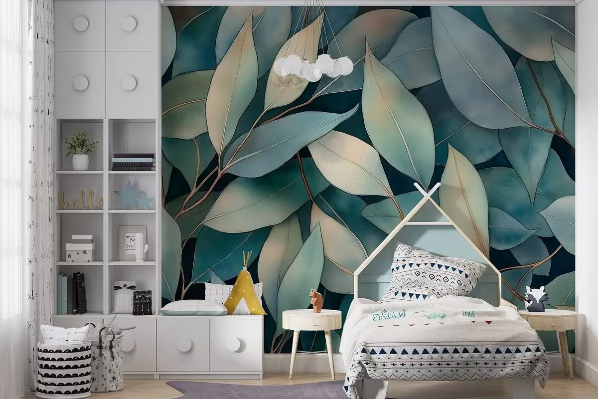 Murais de parede Folhas de eucalipto, desenho em estilo aquarela, padrão floral, cores verdes Nr. w02931
