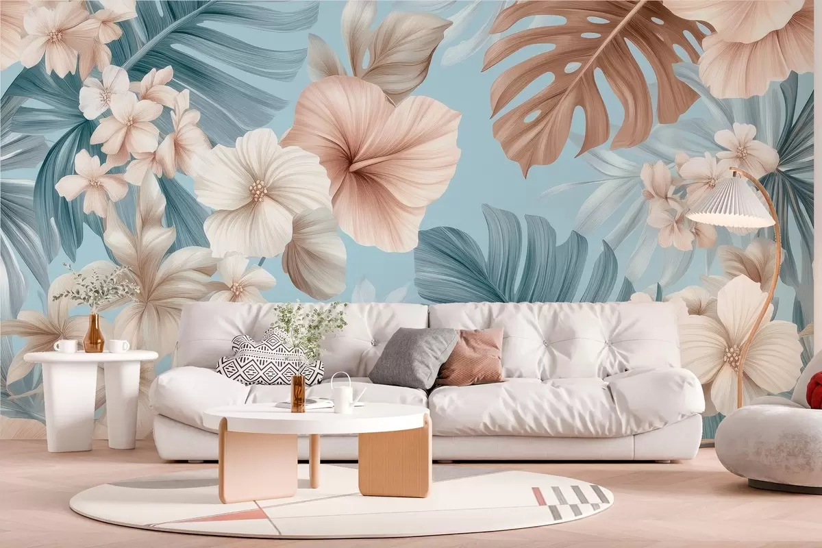 Murais de parede estampa tropical com grandes folhas e flores nas cores azul pastel e bege Nr. w03013