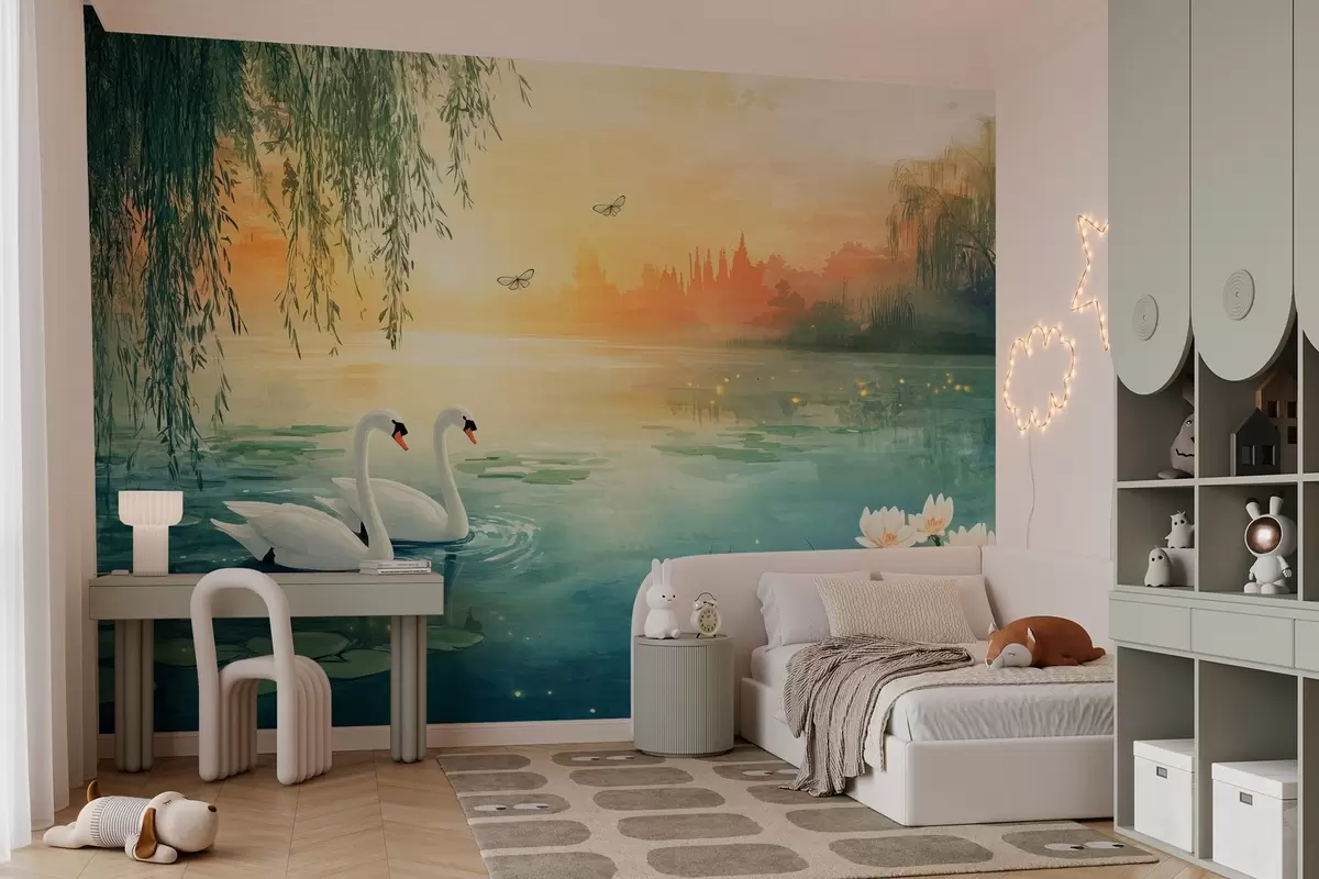 murais de parede Paisagem romântica no estilo de pintura a óleo com dois cisnes brancos no lago w03017