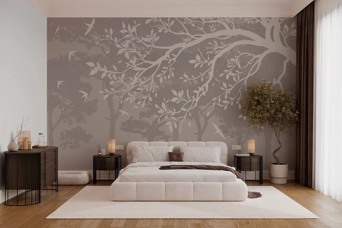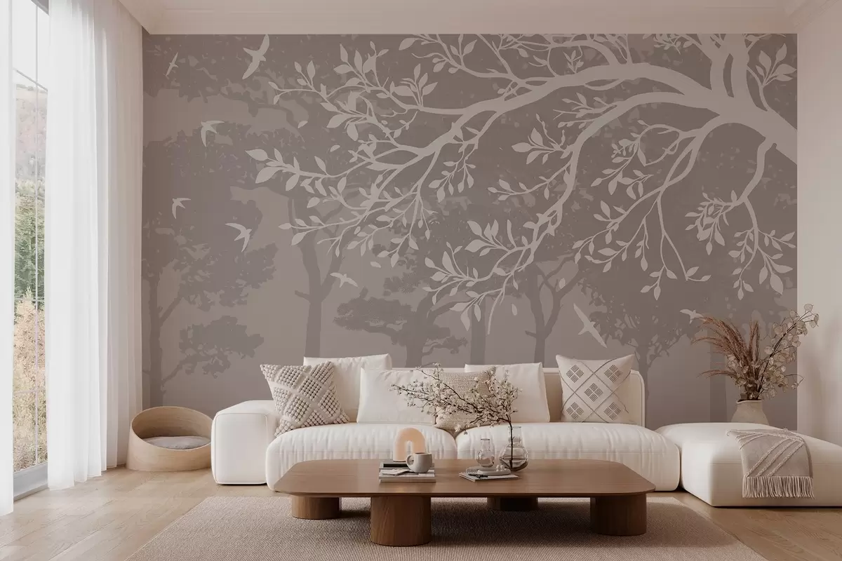Murais de parede silhueta de um galho de árvore cremoso com pássaros, no fundo da floresta Nr. w03116