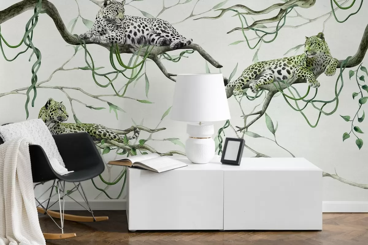 Murais de parede Leopardos nas árvores da selva, cipós, tropical, animais selvagens, paleta de cores verde Nr. w03146v1