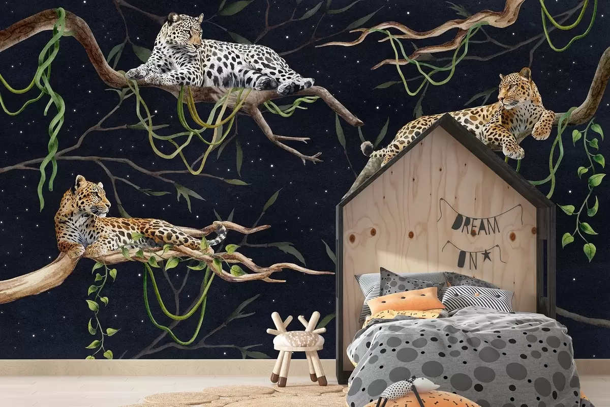 Murais de parede Leopardos nas árvores da selva, cipós, tropical, animais selvagens, céu noturno com estrelas Nr. w03148