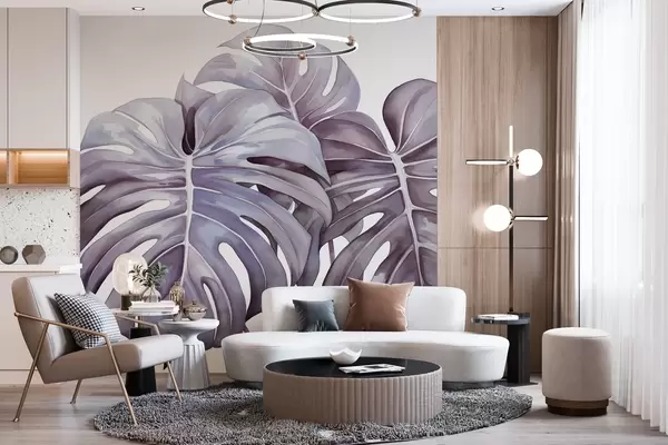 Murais de parede Folhas grandes de monstera, plantas tropicais, desenho em estilo aquarela, cores violetas Nr. w03151v1