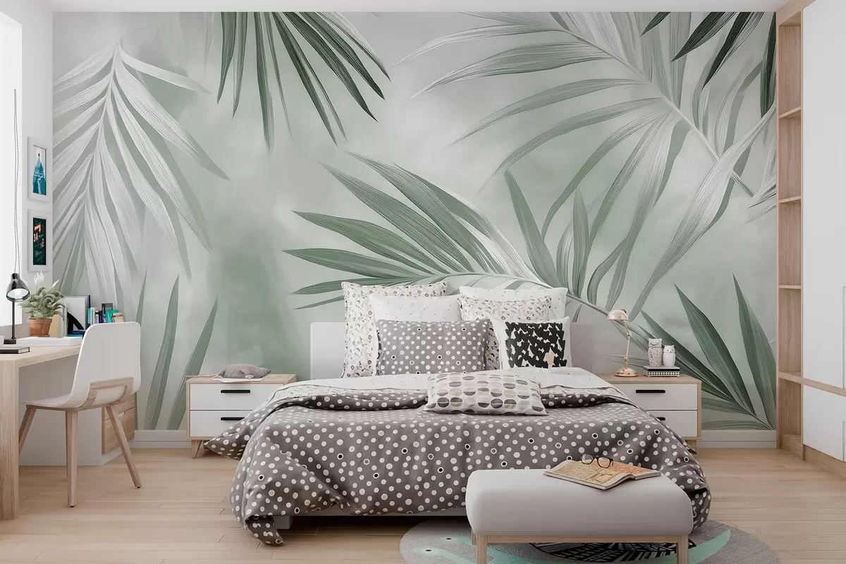 murais de parede Abstração de folhas tropicais, palmeira, paleta de cores verdes  w03153v2