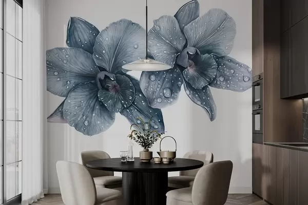 Murais de parede Lindas flores de orquídea, desenho em estilo aquarela, cores azuis Nr. w03164v2