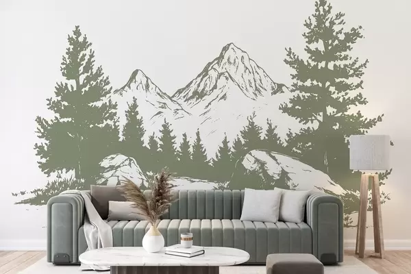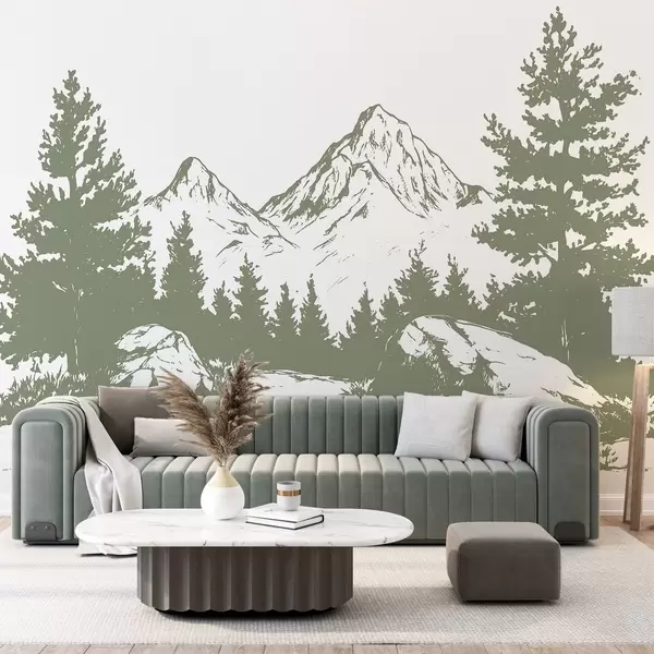 Murais de parede Os Alpes, montanhas com floresta, desenho de linha, cor verde Nr. w03342v1