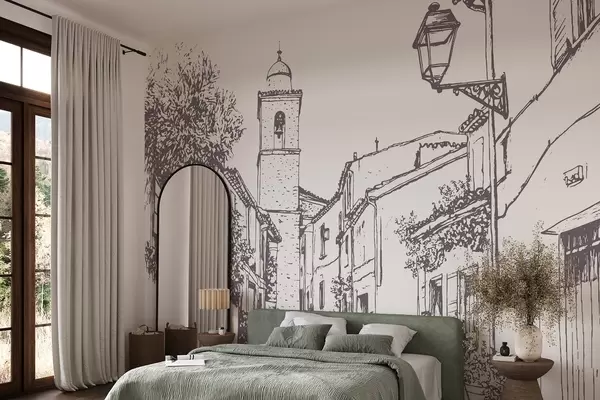 Murais de parede Rua da cidade, bela arquitetura, edifícios, Mediterrâneo, desenho de linha, cor bege Nr. w03345v1