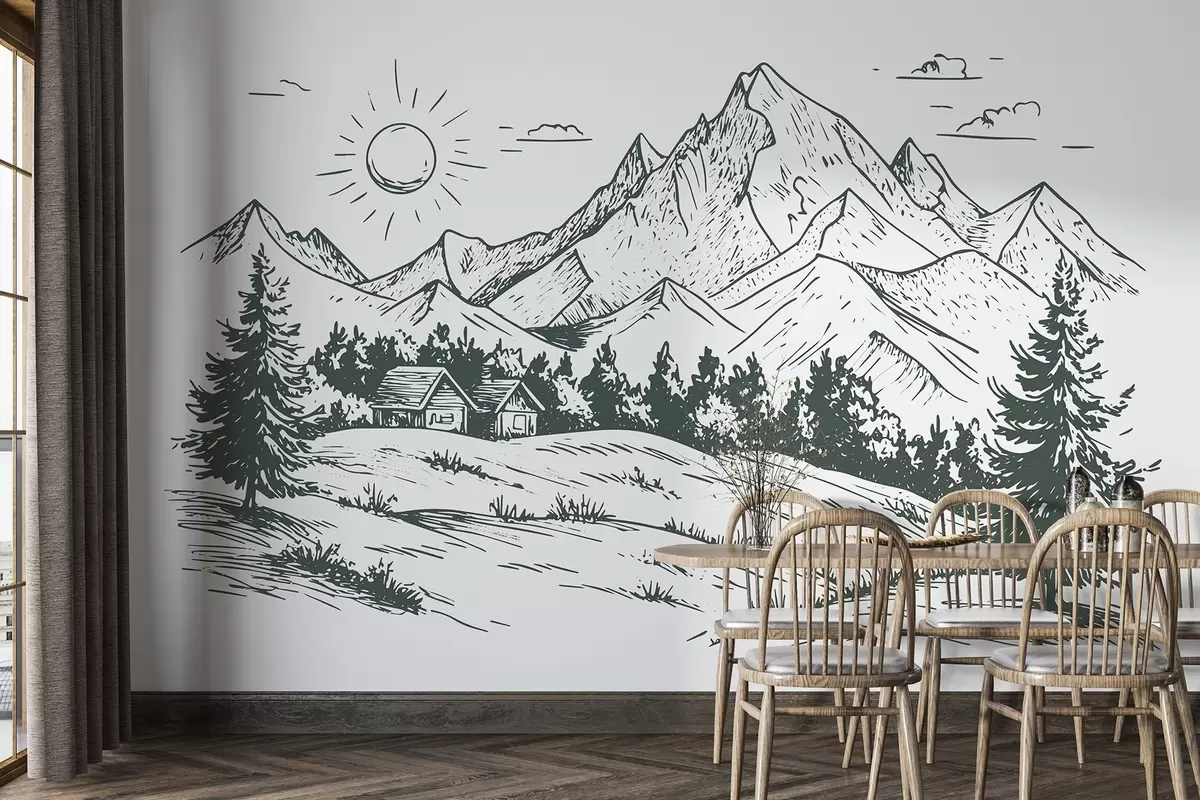 murais de parede Desenho de montanhas, paisagens naturais, floresta, casas de madeira, cor verde w03347