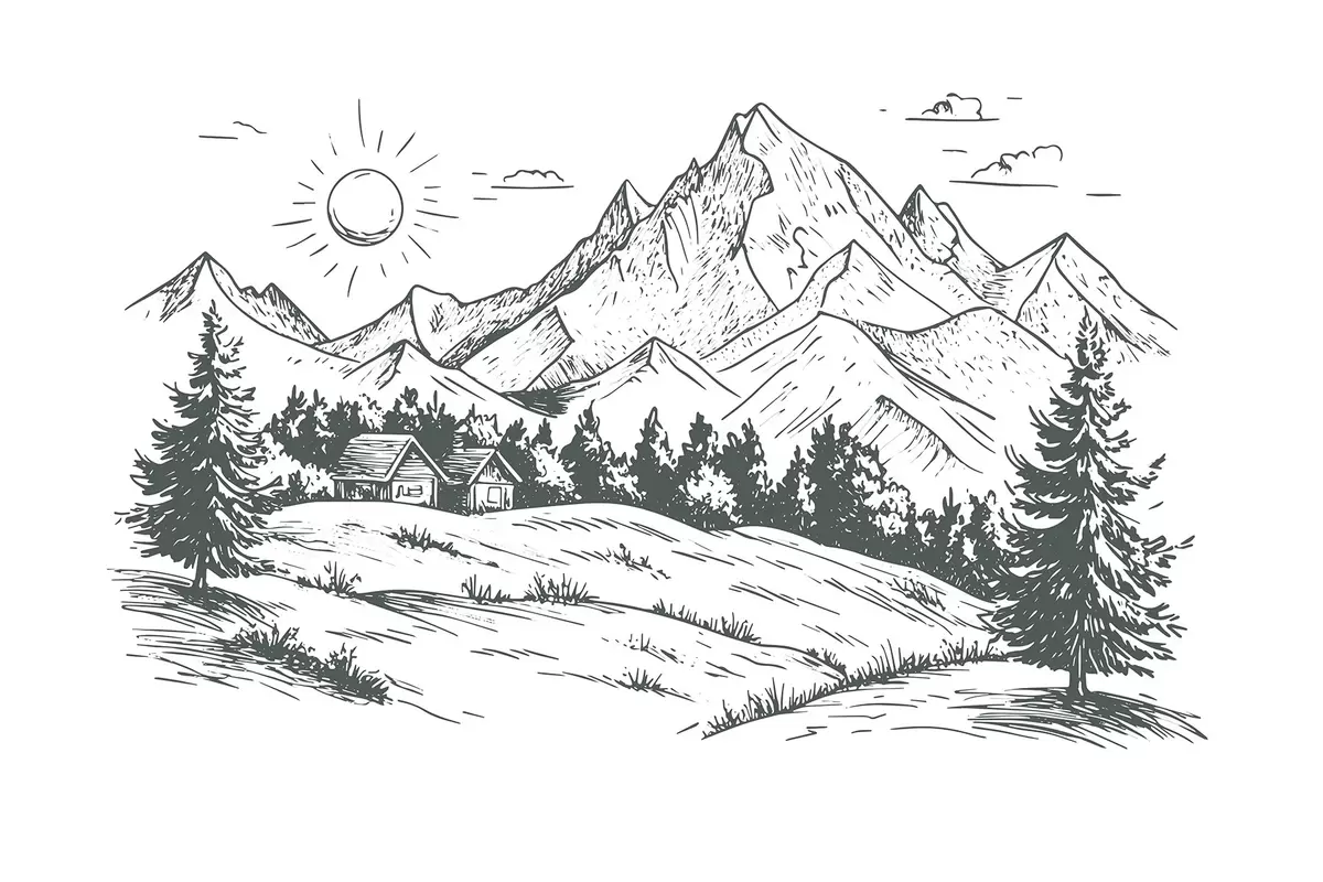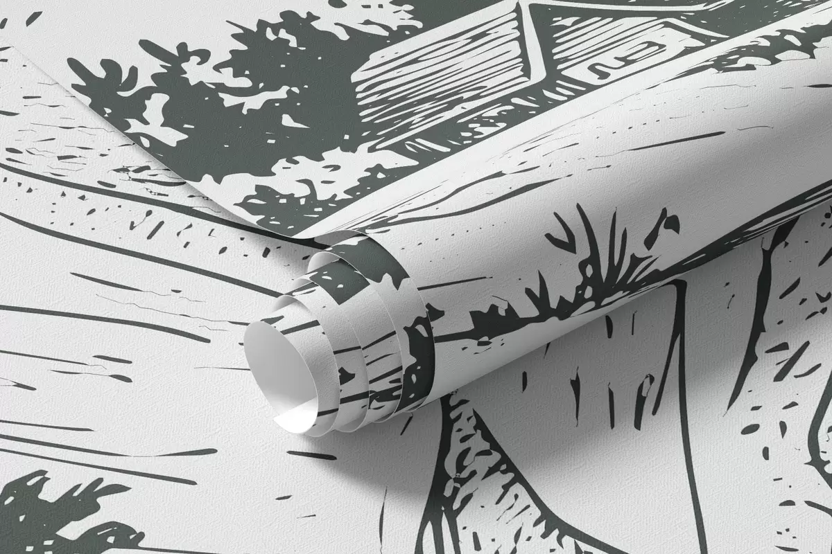 Murais de parede Desenho de montanhas, paisagens naturais, floresta, casas de madeira, cor verde Nr. w03347