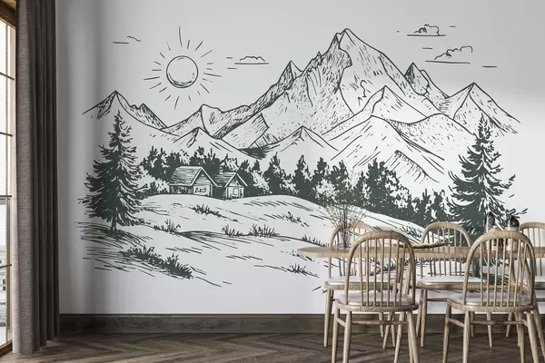 Murais de parede Desenho de montanhas, paisagens naturais, floresta, casas de madeira, cor verde Nr. w03347