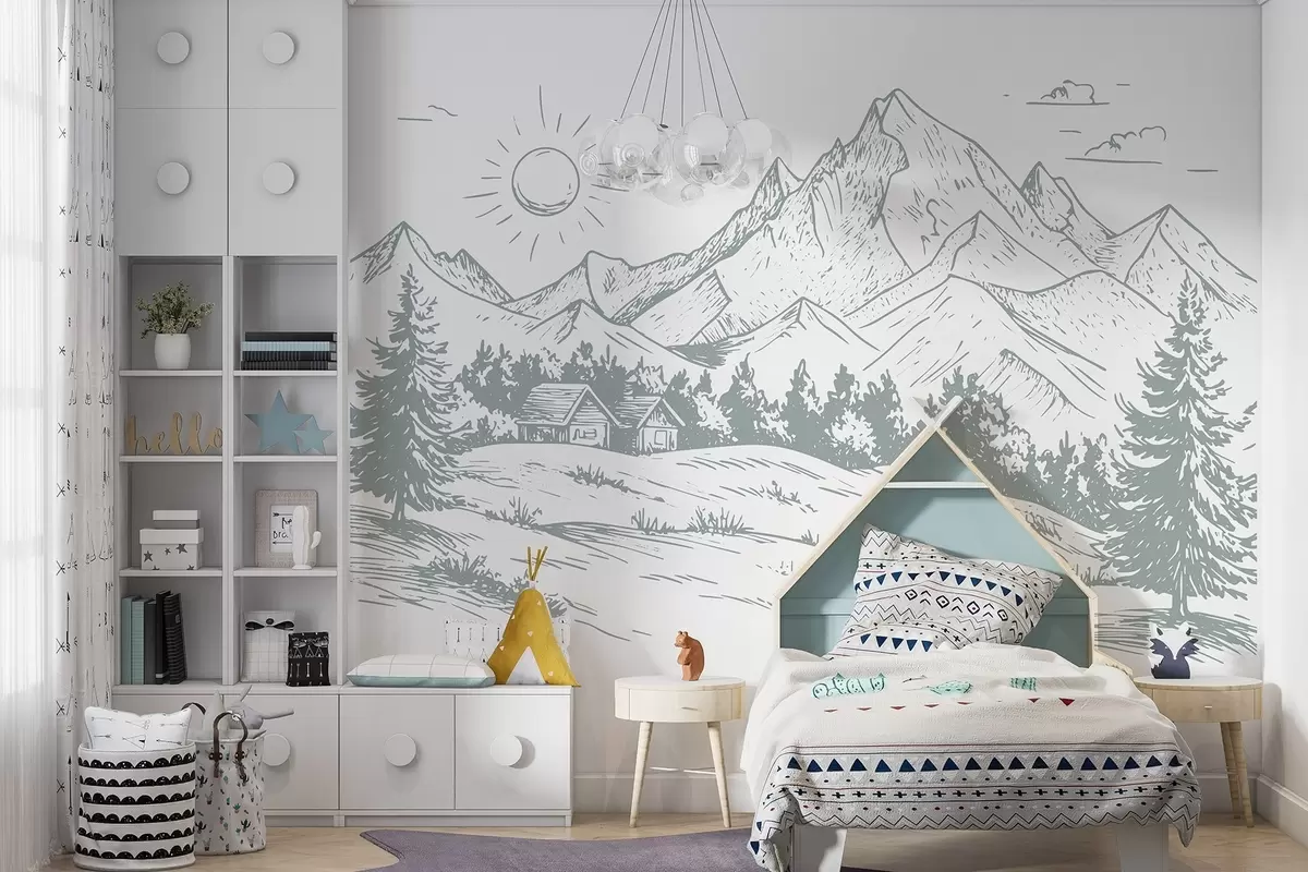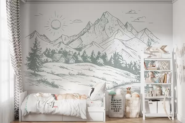 Murais de parede Desenho de montanhas, paisagens naturais, floresta, casas de madeira, cor de menta Nr. w03347v1