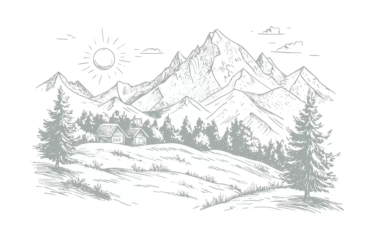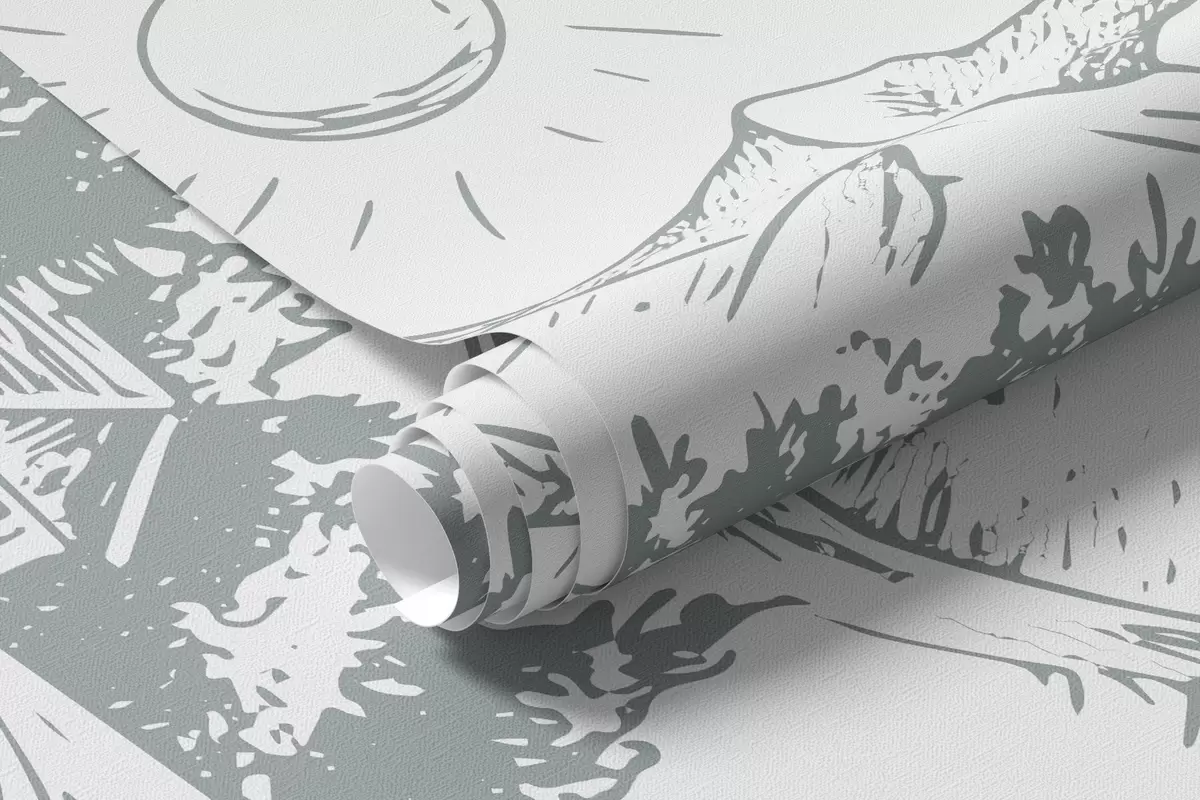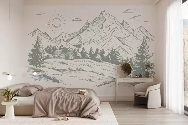 Murais de parede Desenho de montanhas, paisagens naturais, floresta, casas de madeira, cor de menta Nr. w03347v1