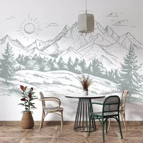 Murais de parede Desenho de montanhas, paisagens naturais, floresta, casas de madeira, cor de menta Nr. w03347v1