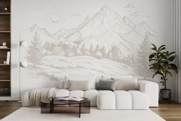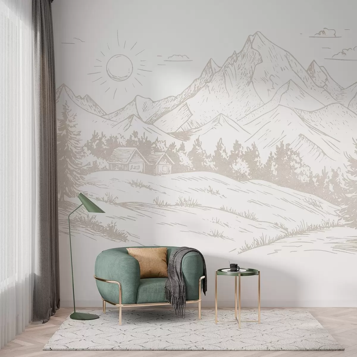 Murais de parede Desenho de montanhas, paisagens naturais, floresta, casas de madeira, cor bege Nr. w03348