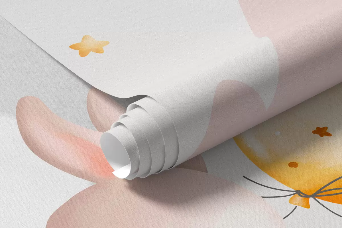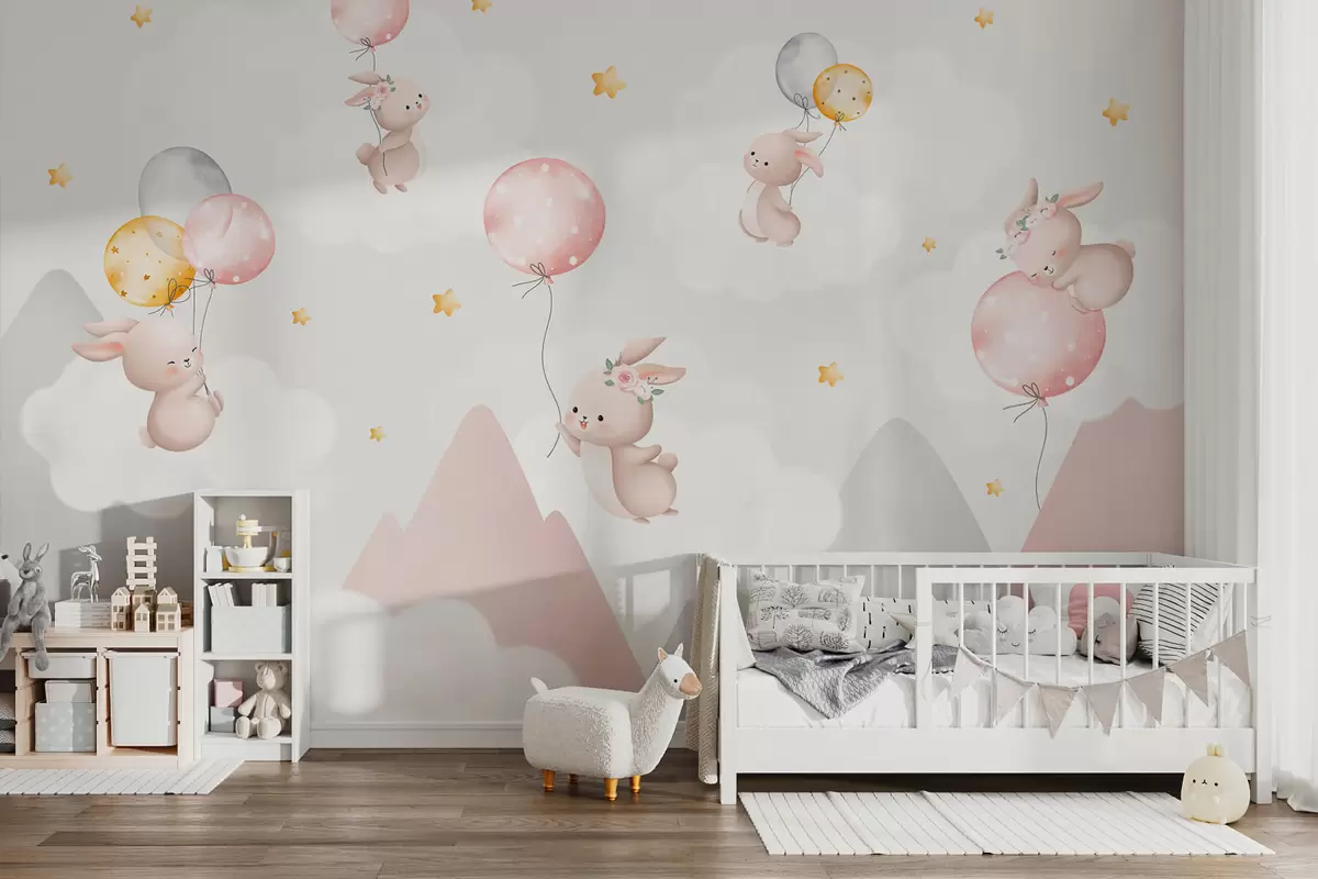 Murais de parede Coelhinhos com balões em nuvens entre picos de montanhas Nr. w03375