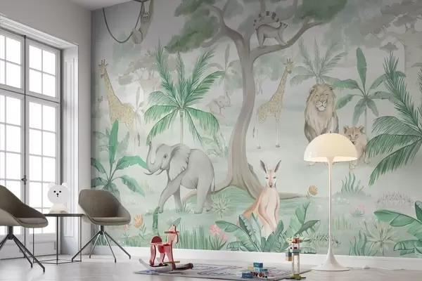 Murais de parede Panorama da selva com animais em tons de verde Nr. w03444v2