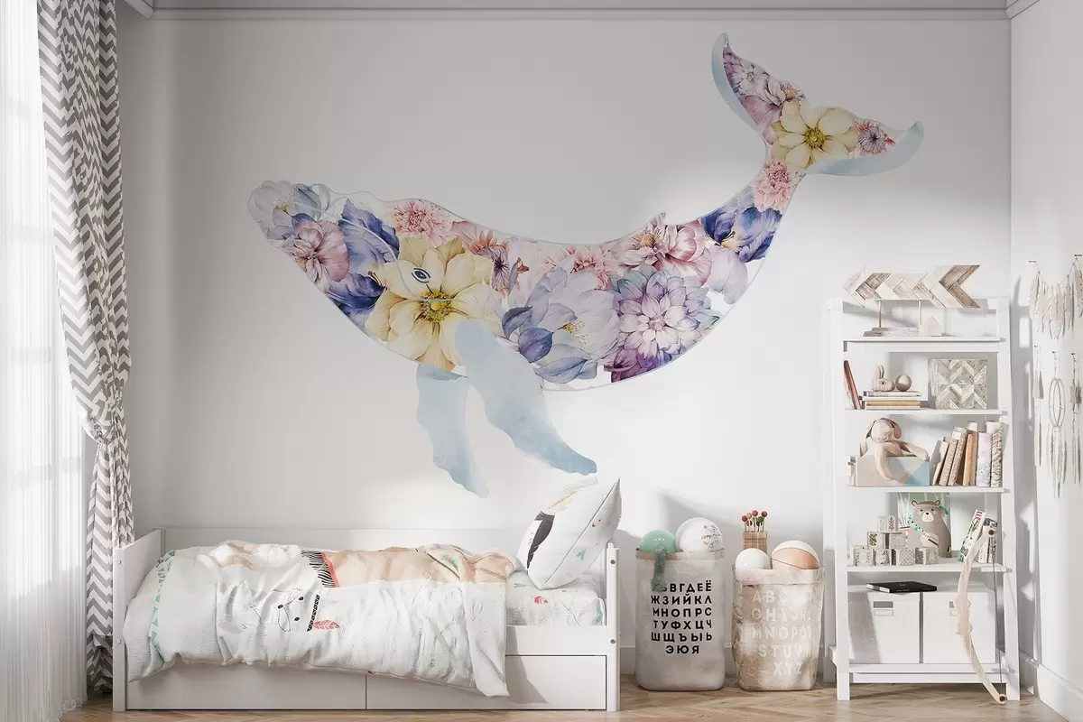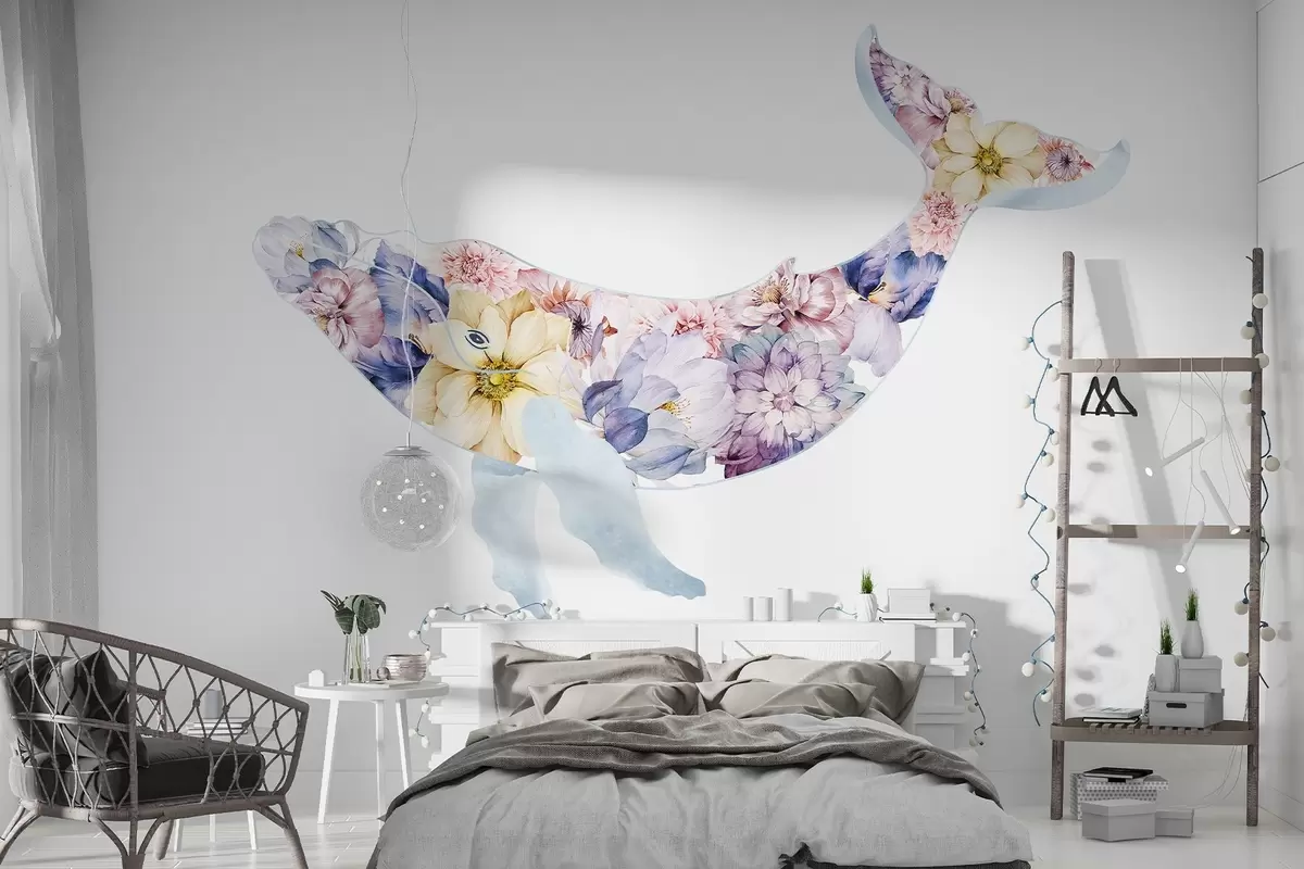 Murais de parede Linda baleia com flores em aquarela, animais marinhos, coloridos Nr. w03445
