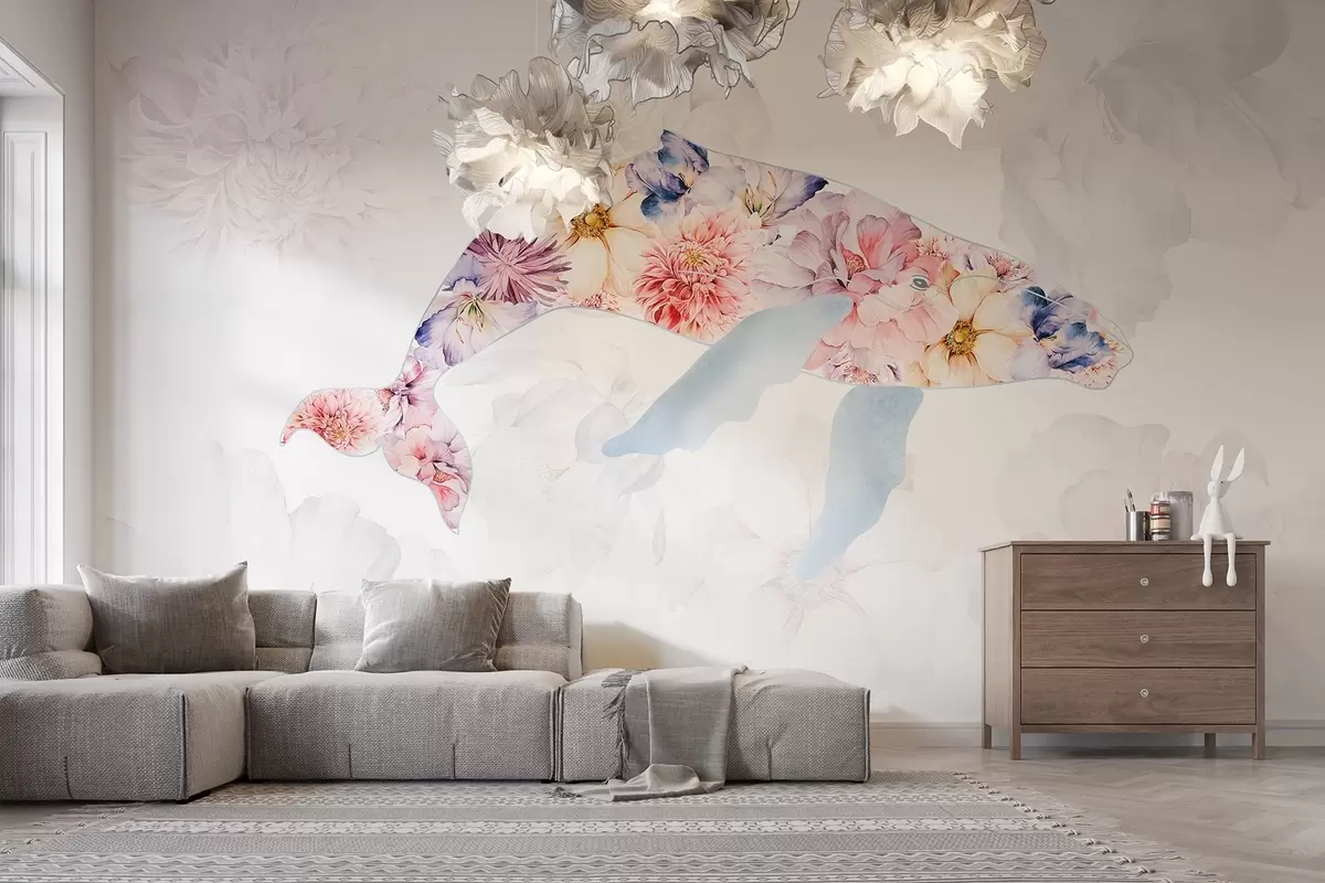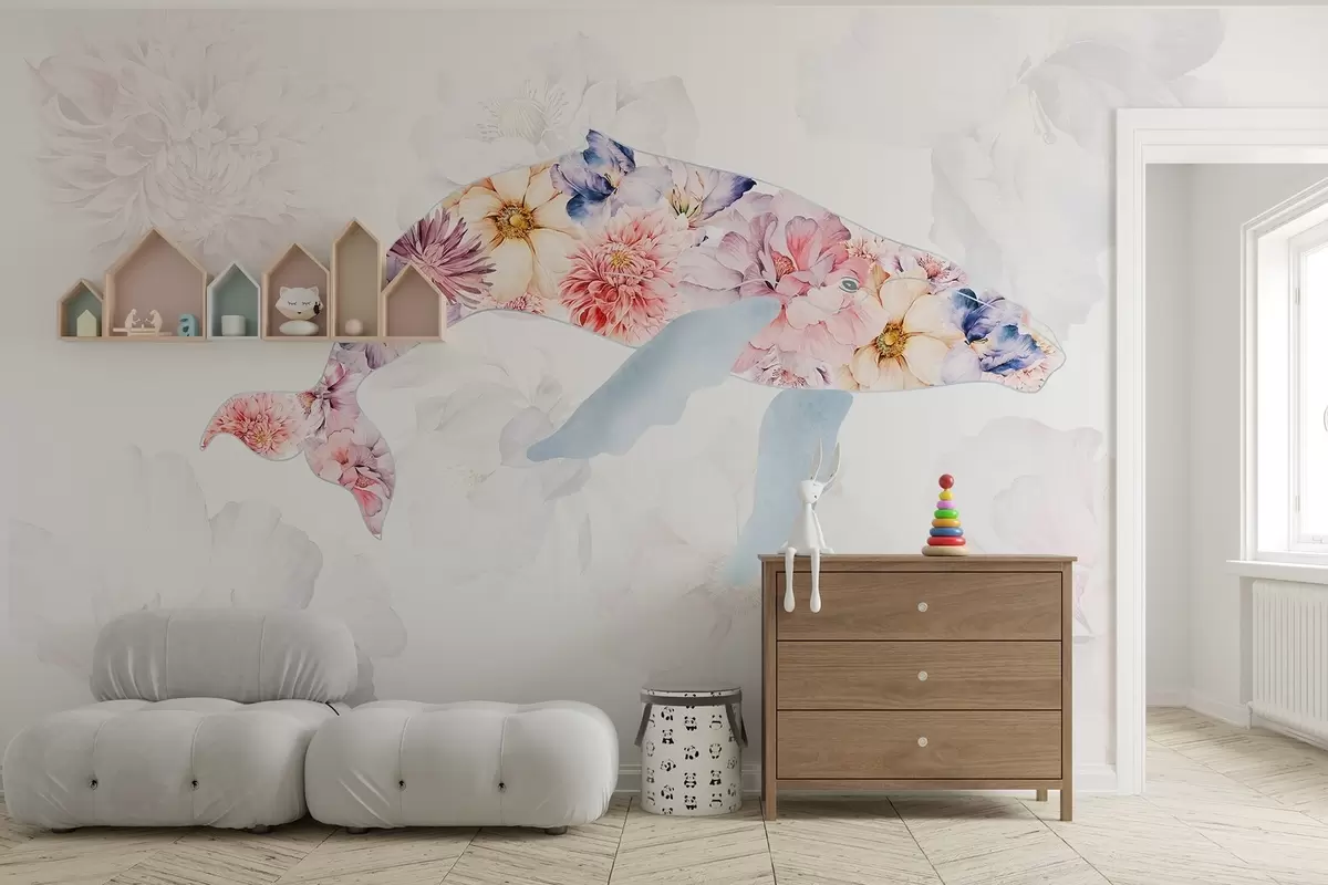murais de parede Baleia com flores em aquarela, animais do oceano, minimalismo, colorido w03446