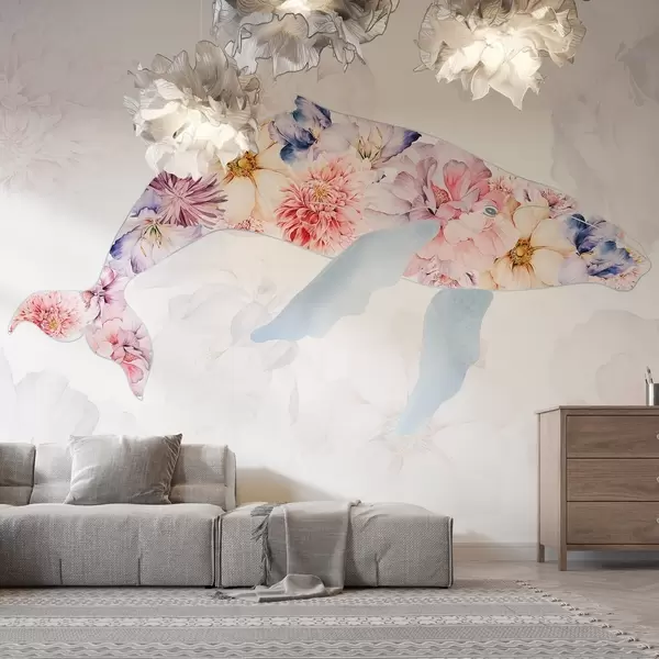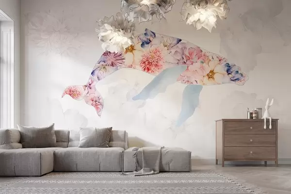 Murais de parede Baleia com flores em aquarela, animais do oceano, minimalismo, colorido Nr. w03446