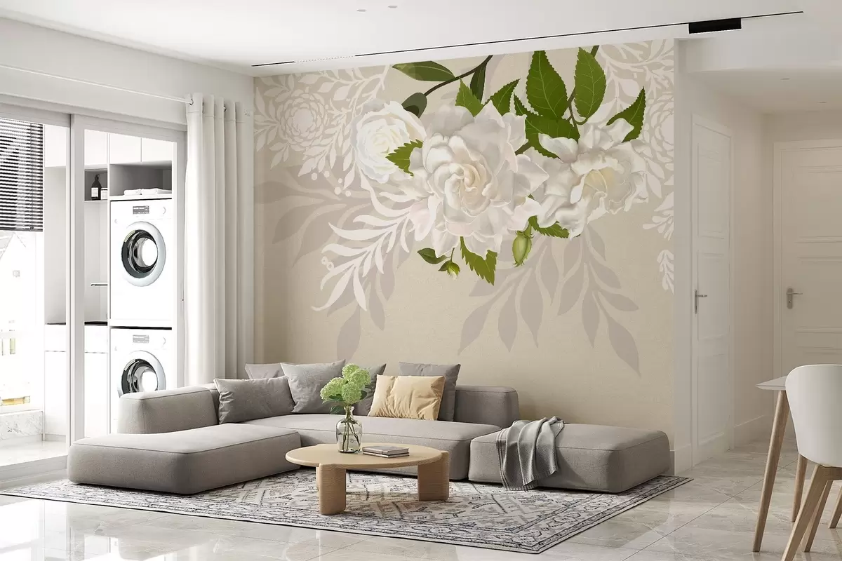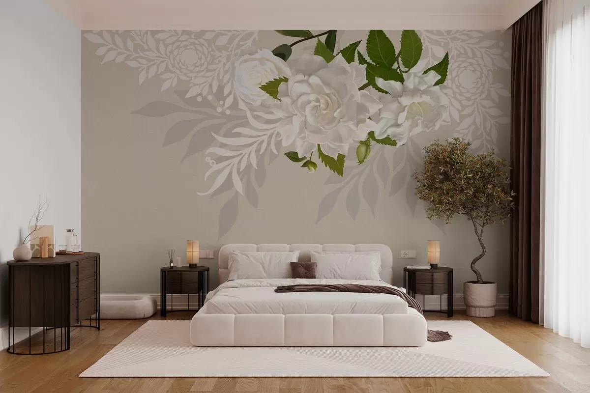 Murais de parede rosas brancas em um fundo bege estampado Nr. w03453