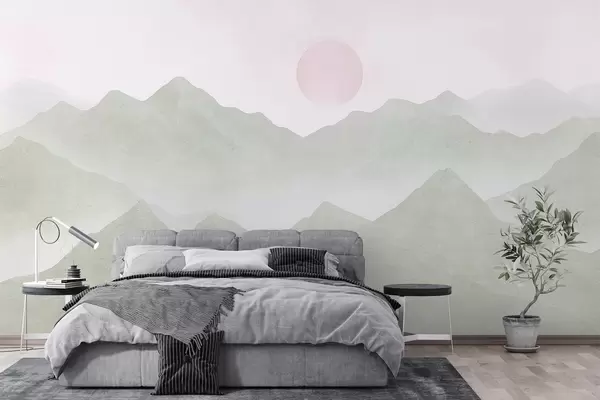 Murais de parede Paisagem de montanhas em estilo Boho, pôr do sol, pastel suave, verde Nr. w03547