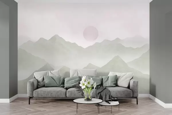 Murais de parede Paisagem de montanhas em estilo Boho, pôr do sol, pastel suave, verde Nr. w03547