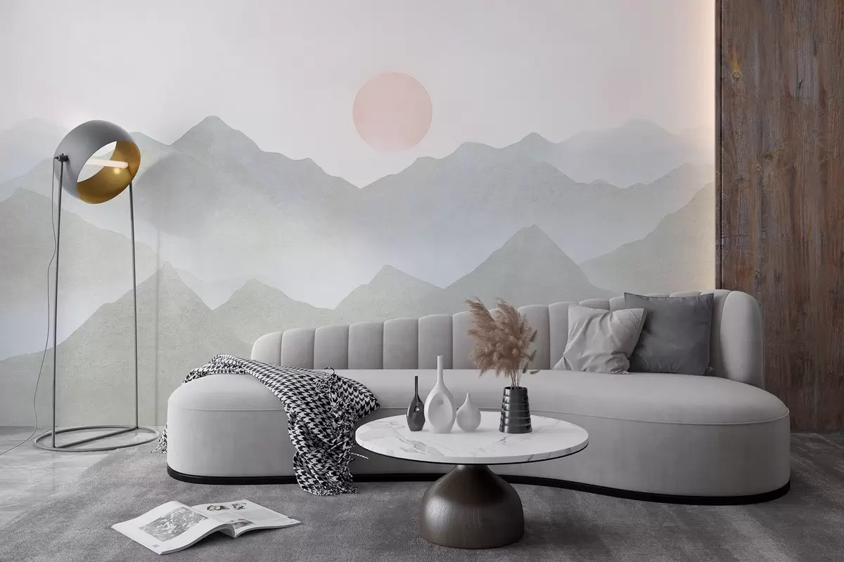 Murais de parede Paisagem de montanhas em estilo Boho, pôr do sol, pastel suave, cinza Nr. w03547v1