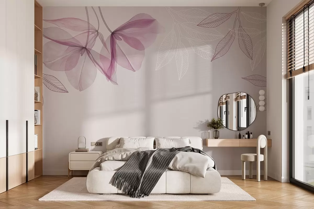 Murais de parede delicadas flores e folhas translúcidas em tons de roxo Nr. w03616v4