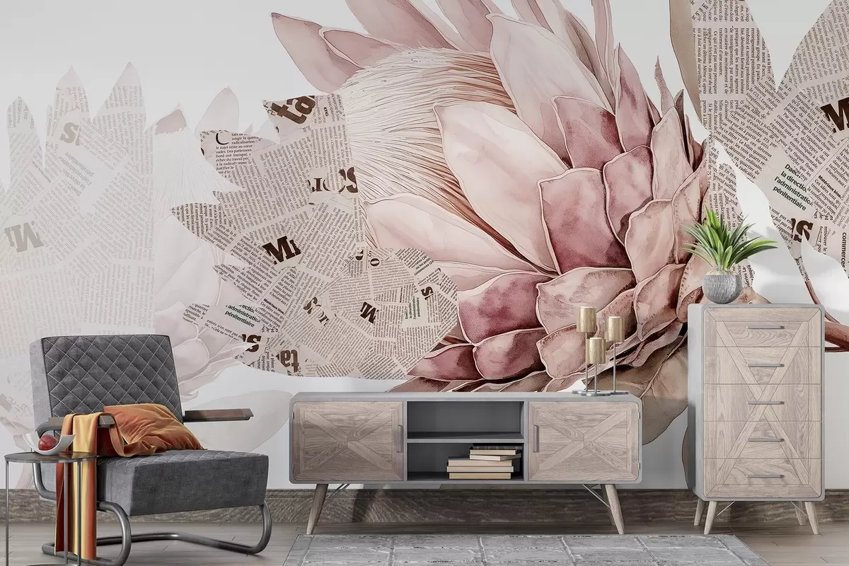 Murais de parede Flores Protea, arte de jornal, floral, tropical, cores bege pastel Nr. w03667v4