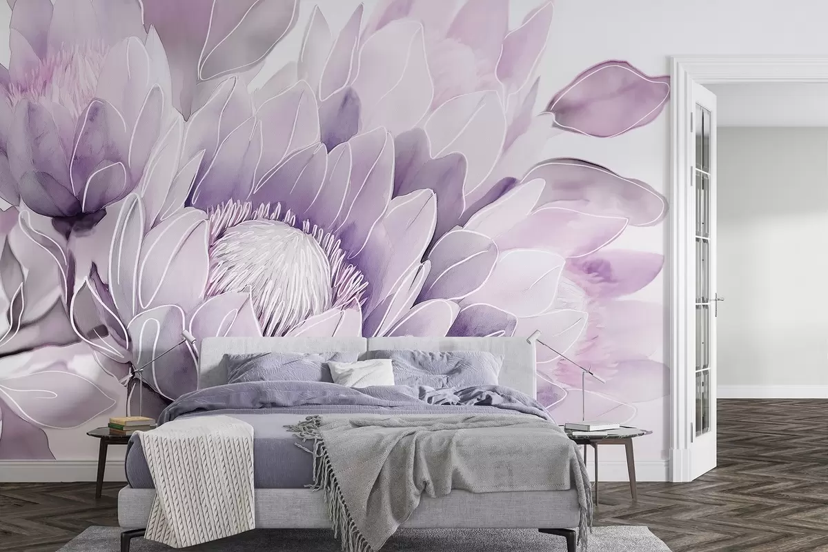 Murais de parede Lindas flores de protea, desenho de arte de linha, tropical, cores roxas Nr. w03669v1