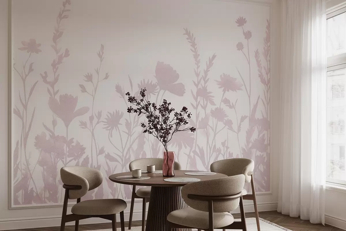 murais de parede Prado de verão, rústico, flores, paleta de cores rosa  w03670v2