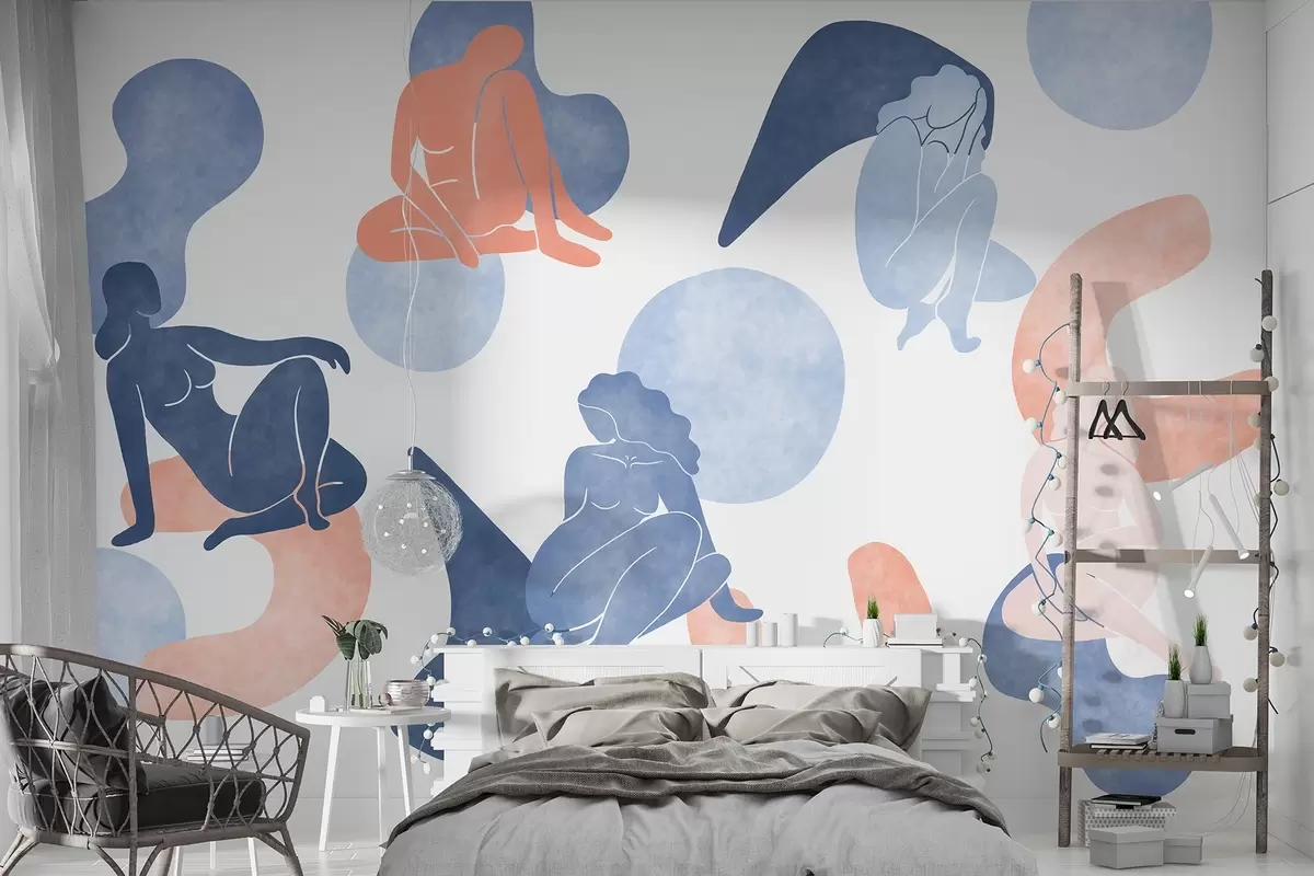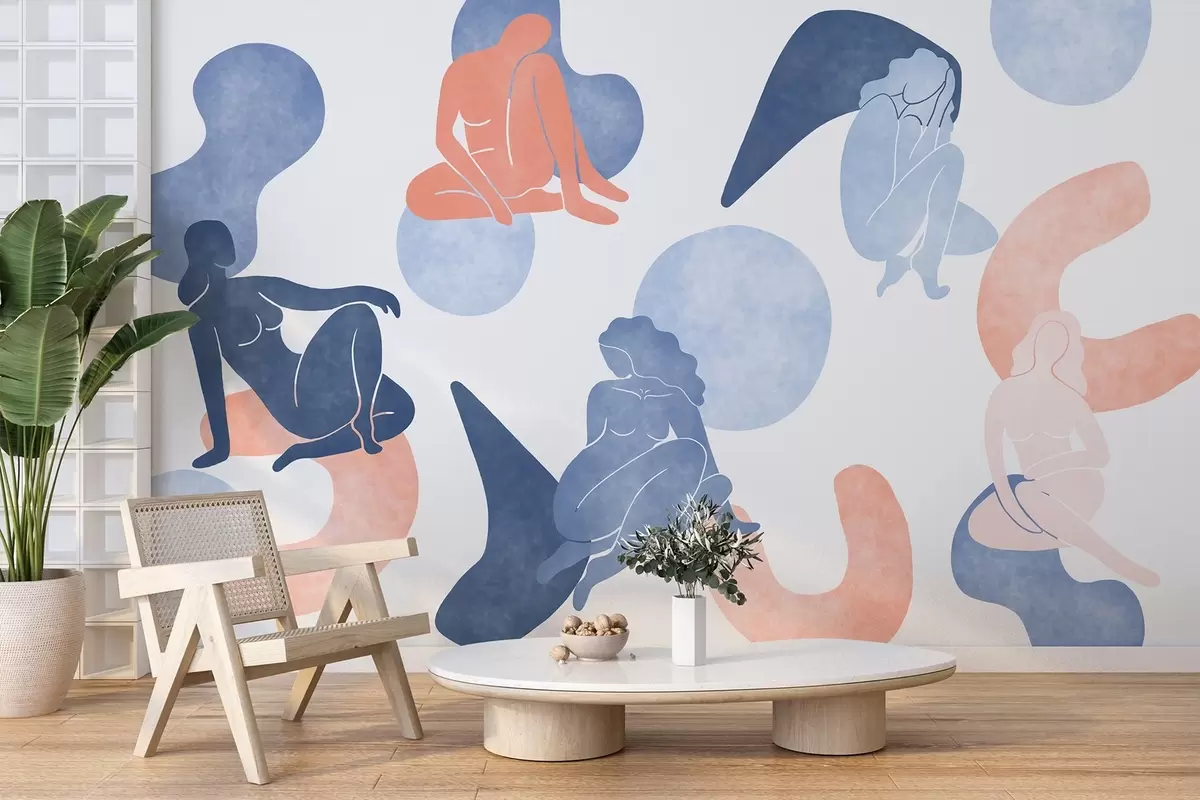 Murais de parede Abstrações geométricas com silhuetas femininas, estilo boho, azul, bege, rosa Nr. w03753v1