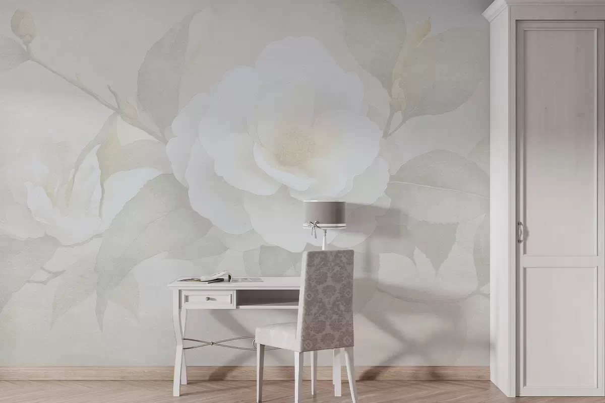 Murais de parede Pastel suave com flores de camélia no galho, cores bege Nr. w03760