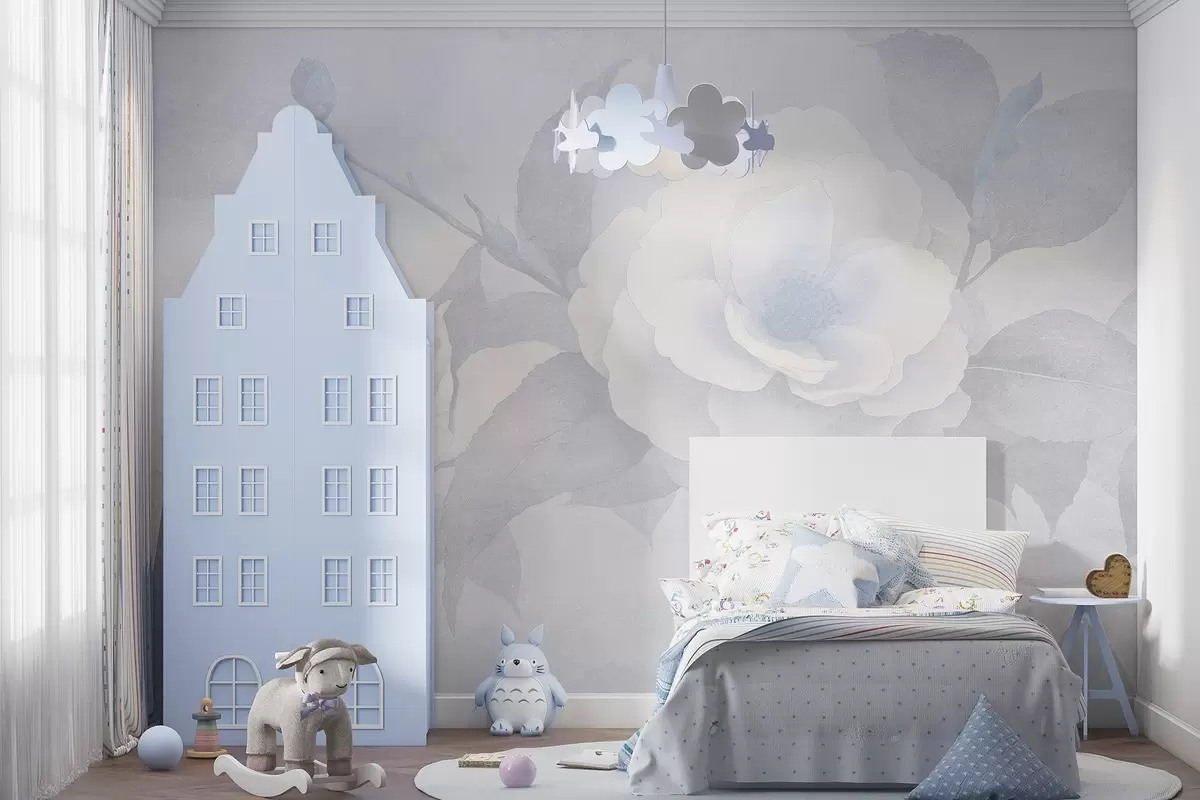 Murais de parede Pastel suave com flores de camélia no galho, cores azuis Nr. w03760v1