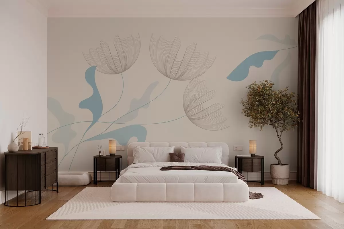 Murais de parede flores elegantes e minimalistas em tons de azul claro sobre um fundo bege Nr. w03763v1