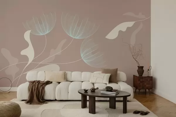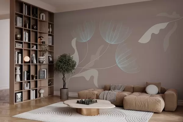 Murais de parede flores elegantes e minimalistas em tons de branco e azul em um fundo mocha Nr. w03763v3