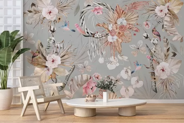 murais de parede Ornamento estilo Boho com flores de peônia e pássaros, estilo aquarela, cores bege w03885