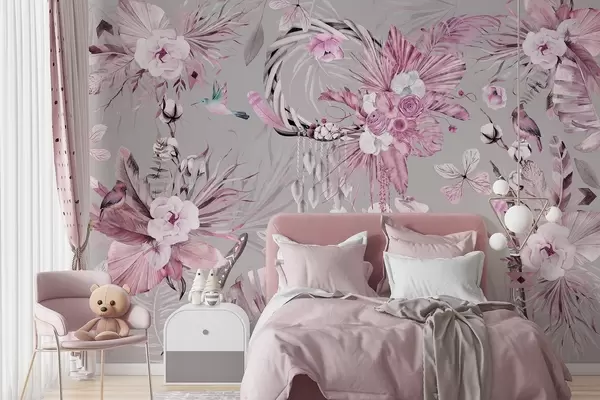 Murais de parede Ornamento estilo Boho com flores de peônia e pássaros, estilo aquarela, cores rosa Nr. w03885v1