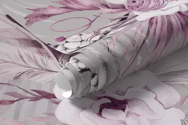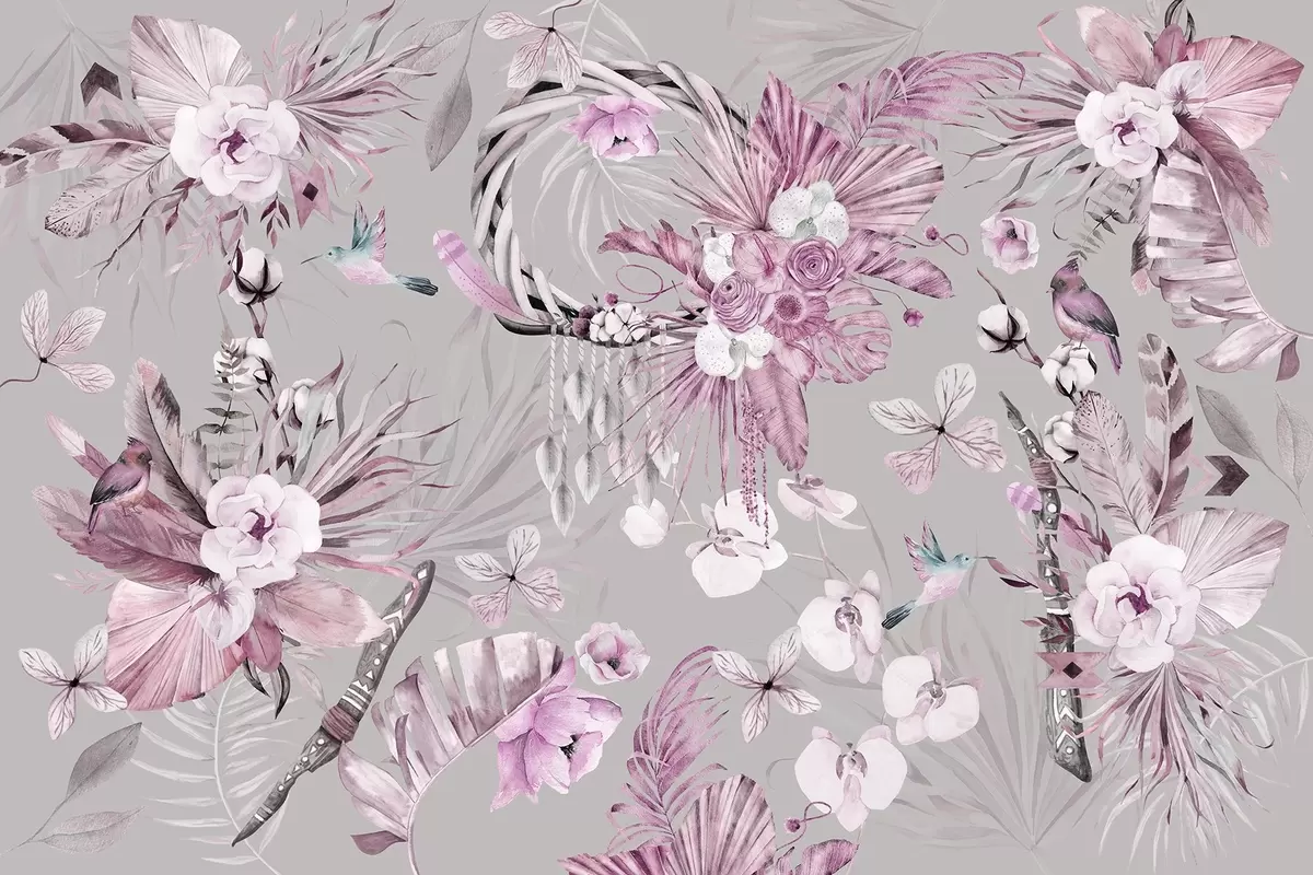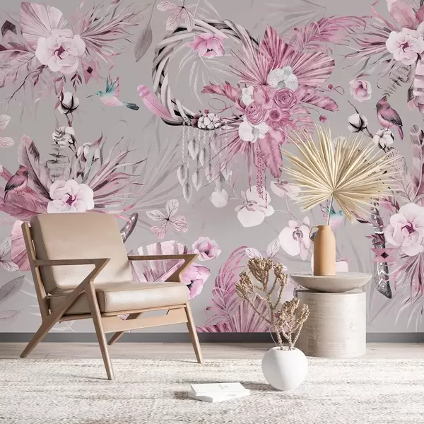Murais de parede Ornamento estilo Boho com flores de peônia e pássaros, estilo aquarela, cores rosa Nr. w03885v1