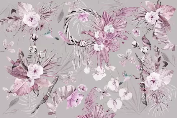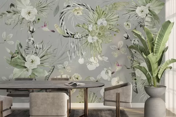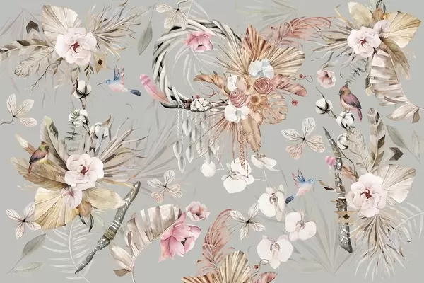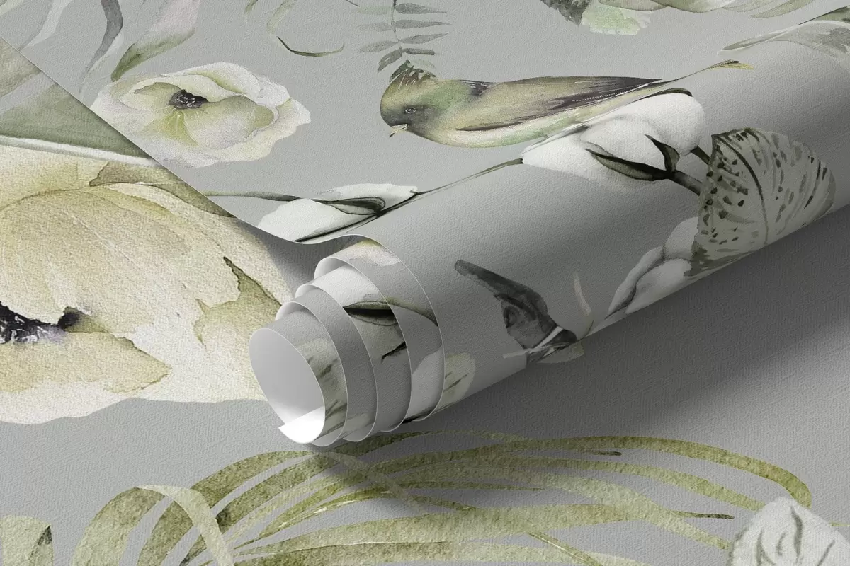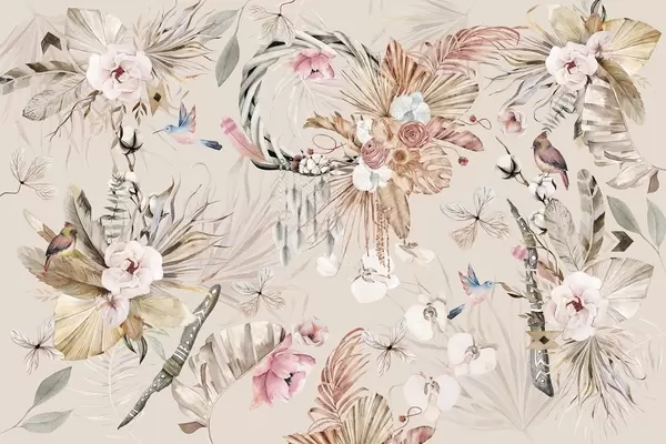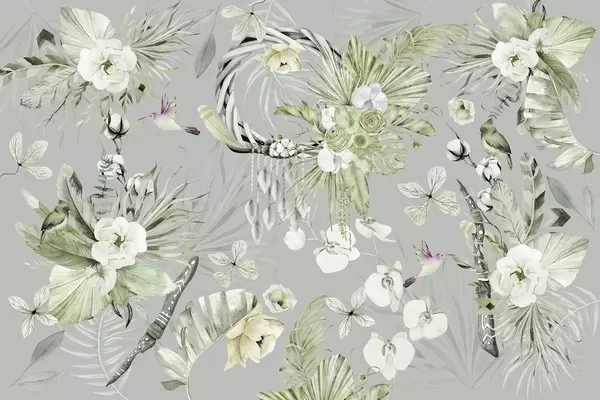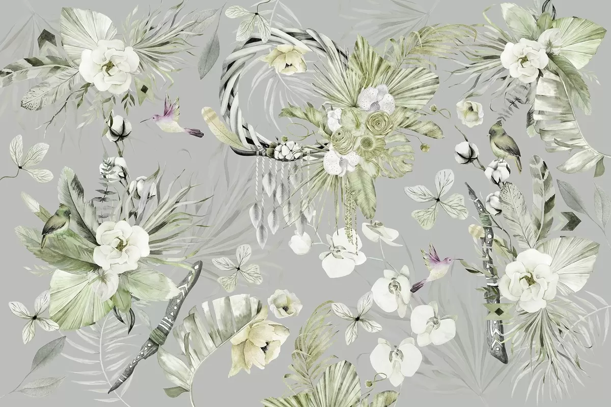 Murais de parede Ornamento estilo Boho com flores de peônia e pássaros, estilo aquarela, cores verdes Nr. w03885v2