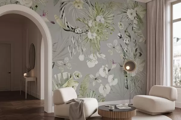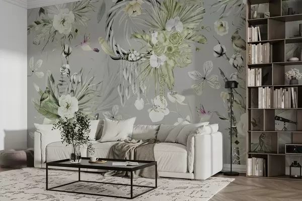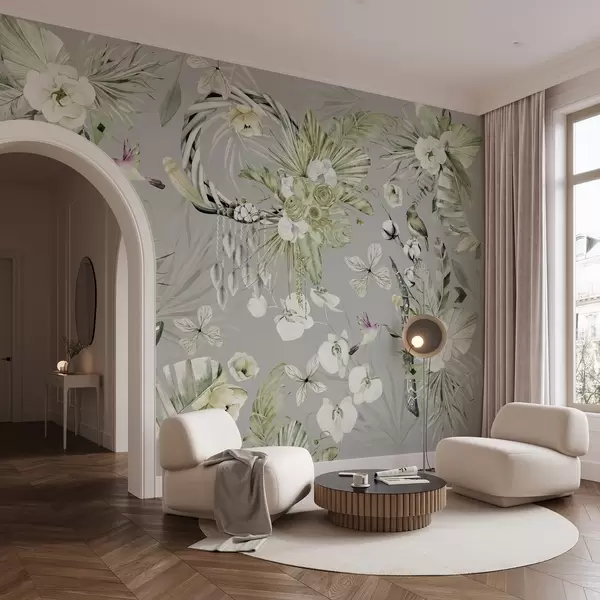 Murais de parede Ornamento estilo Boho com flores de peônia e pássaros, estilo aquarela, cores verdes Nr. w03885v2