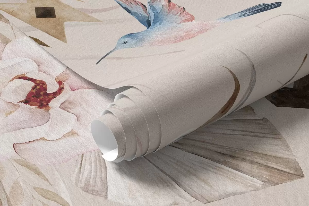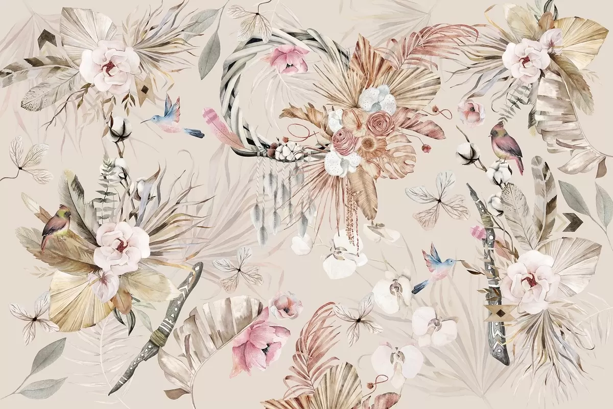 Murais de parede Ornamento estilo Boho com flores de peônia e pássaros, estilo aquarela, cores suaves Nr. w03885v3