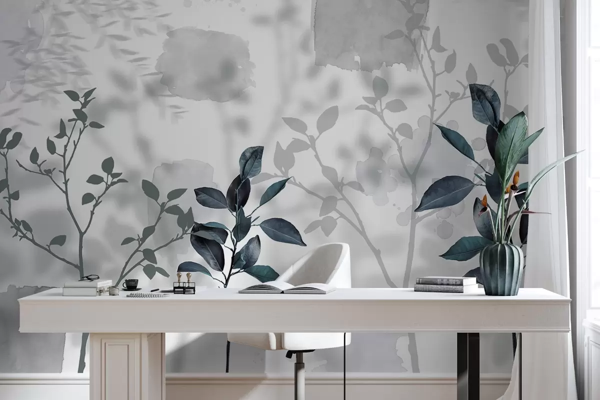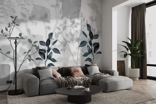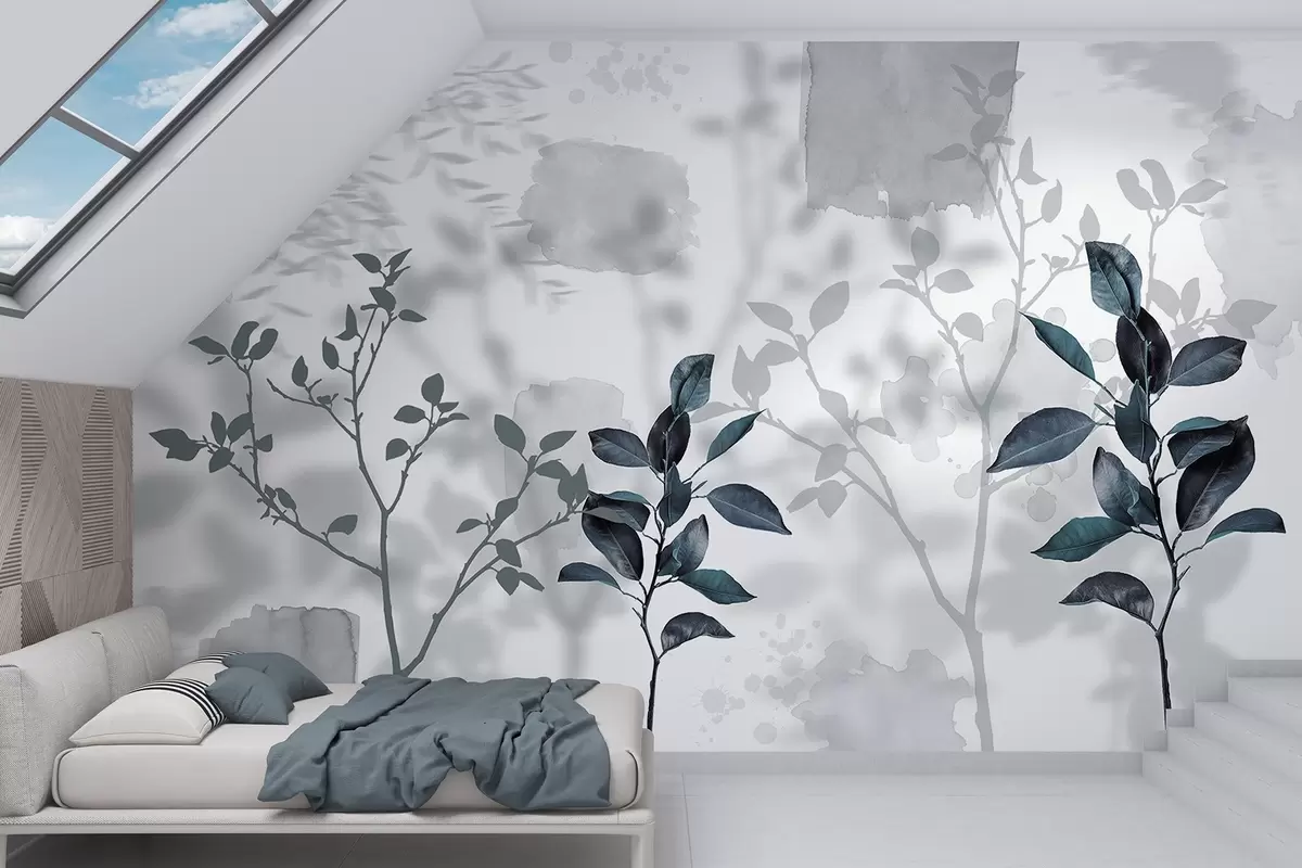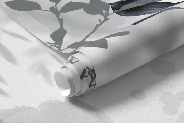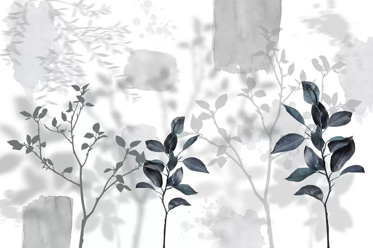Murais de parede Folhas de limoeiro, sombras de galhos de árvores, natureza, aquarela, azul Nr. w03910v2
