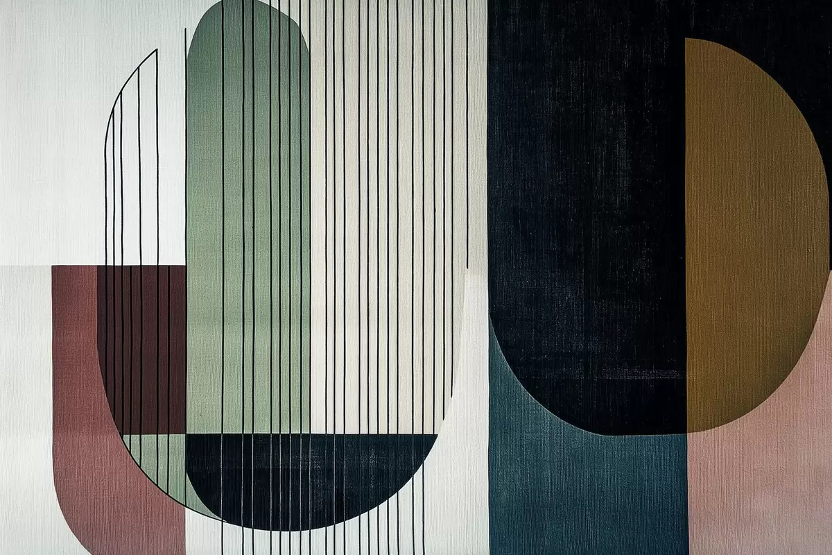 Murais de parede composição geométrica abstrata moderna com formas sobrepostas e padrões de linhas verticais, linhas finas preenchendo trapézios e ovais, sobreposição de textura têxtil suave, tons suaves e quentes como verde-oliva, taupe, bege e carvão, efeitos sutis de transparência entre as formas Nr. w03937