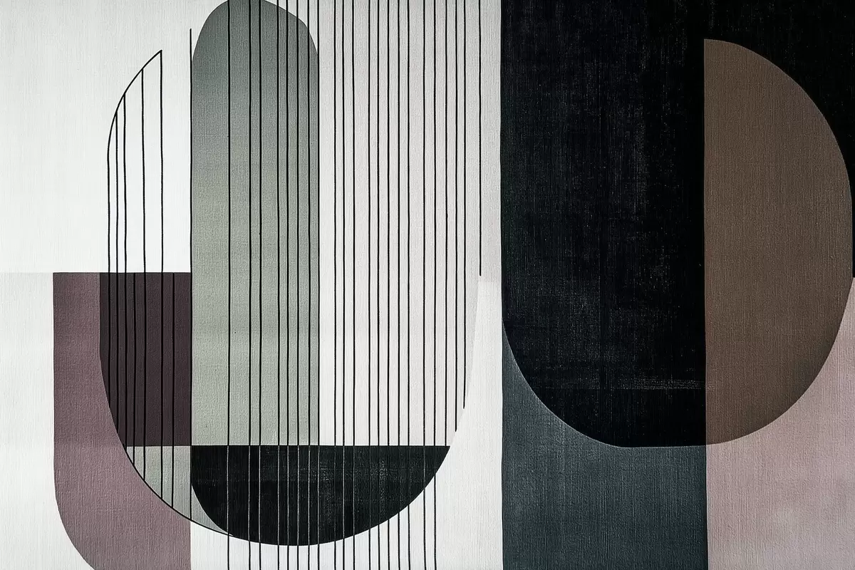 Murais de parede composição geométrica abstrata moderna com formas sobrepostas e padrões de linhas verticais, linhas finas preenchendo trapézios e ovais, sobreposição de textura têxtil suave, tons suaves e quentes como verde-oliva, taupe, bege e carvão, efeitos sutis de transparência entre as formas Nr. w03937v1