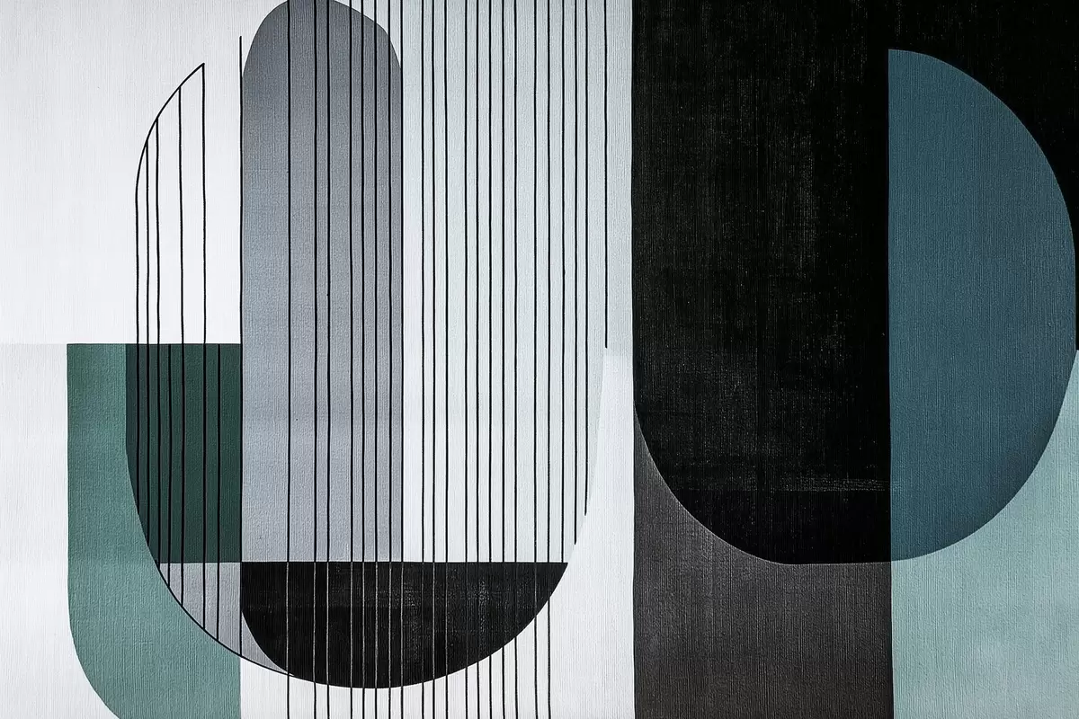 Murais de parede composição geométrica abstrata moderna com formas sobrepostas e padrões de linhas verticais, linhas finas preenchendo trapézios e ovais, sobreposição de textura têxtil suave, tons suaves e quentes como verde-oliva, taupe, bege e carvão, efeitos sutis de transparência entre as formas Nr. w03937v2