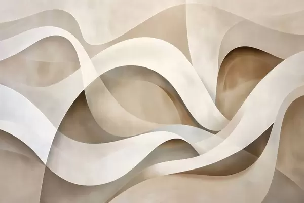 Murais de parede composição abstrata minimalista de formas orgânicas em camadas, cada uma delineada com uma borda branca suave, preenchida com traços lineares internos densos, como textura de tecido ou papel, curvas fluidas em tons neutros de bege, areia, pedra e marfim, aparência em relevo Nr. w03940v2